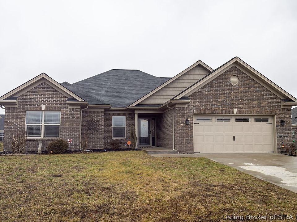 Wow! This all brick home is absolutely STUNNING!! Featuring 3 bedroom, 2 bath home, with a WIDE OPEN FLOOR PLAN, beautiful granite countertops, 10’ living room ceilings and a large primary bedroom. Immediately walk in the front door and fall in love with the beautiful hardwood floors, electric fireplace,gorgeous island and custom kitchen cabinets. The primary bedroom includes an amazing ensuite, featuring a double vanity with granite counter tops and his and her closets. The home is the perfect space for hosting family and friends both inside and out with its COVERED BACK PATIO in the fenced in backyard. Located in highly sought-after area just minutes to the growing River Ridge Commerce Center and Lewis & Clark bridge. This home has so much to offer! Schedule your showing today to see for yourself what all there is to fall in love with. All Sq ft & rm sz approx.