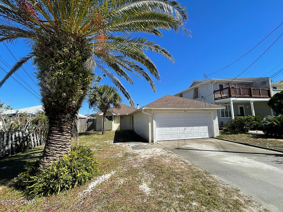 Location, location, location! This beach house is short term rental allowed and is perfect for investors to flip or hold! Great location, walk to beach access 12 with public parking for golf carts/cars, and just one block north of Thomas Dr. The home needs TLC, but would be a rental machine. 2 BR, 2 BA with extra Bunk Room that could be made into a 3rd bedroom with a closet build out; Living room has fireplace & vaulted ceiling, kitchen w/breakfast bar, dining room, 2 car garage, fenced yard. Beautiful palms and fruit trees in the back. Septic tank in back yard. Don't miss this investor special!