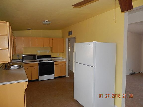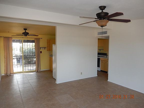 This 3 bedroom/2 bathroom home has an open and inviting living space with beautiful ceramic floor and raised ceiling that leads in to the formal dining area right off the kitchen. You're going to love the kitchen with it's cheery color and original cabinets that have been refurbished and take you back to a time where quality built meant something. Bedrooms are good-sized with new ceiling fans in all. You'll enjoy the back yard with natural desert landscaping, large covered patio, and storage shed for the extras. This home comes with all appliances and is available today. Call for your private showing.