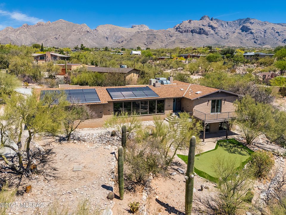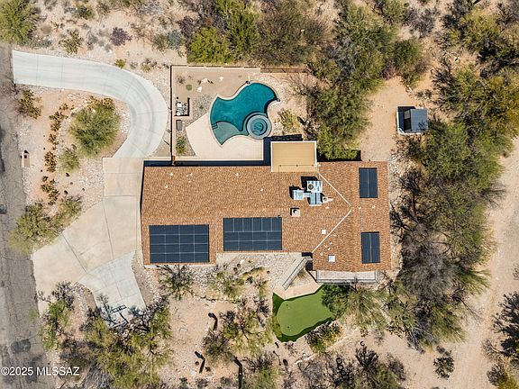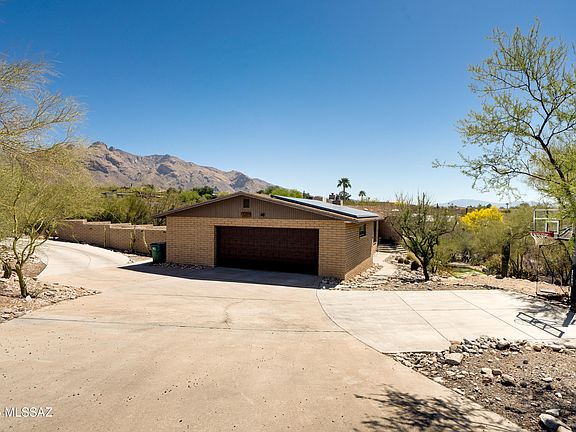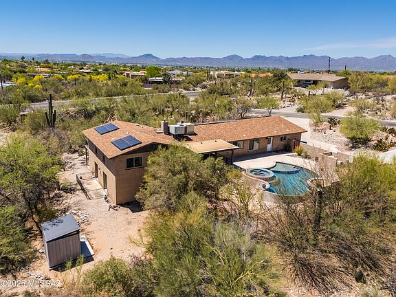 RANGE PRICING: $715K-$725K: Refreshed Ranch Revival on corner lot in Santa Catalina Estates of Greater Tucson's coveted Catalina Foothills - minutes away from premium retail, upscale dining, and world-class recreation.Inside, enjoy a smartly split multilevel floorplan - main level features sprawling living area & adjacent formal dining space with exquisite wall of windows showcasing picture-perfect city views; double sliding glass door back patio access via separate great room with fireplace flowing seamlessly into spacious open-concept gourmet kitchen with granite counters, premium cabinetry, and breakfast nook; hallway off of garage (extended 2-car with dynamic drained work/shop area) provides additional back patio & pool access; opposite wing on main level leads from front foyer to standalone full bathroom, and three bedrooms - including outstanding Primary/Owner's Suite with private balcony access, walk-in closet & ensuite full bathroom with standing shower; stairs off landing from front entry foyer lead down to lower-level, featuring 2 additional full bedrooms (each with outdoor private patio access), flex/media room (with exterior access door to back lower outdoor grounds), third full bathroom, and extensive lounge space with front outdoor patio access.