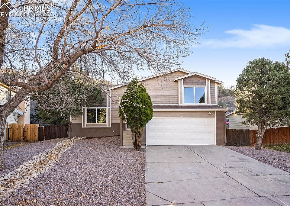 This meticulously maintained home, nestled in Pinon Valley with over 2000 square feet of living space, boasts soaring vaulted ceilings and mountain views; a true must see! The modern oak style wood laminate floors on the main level give the home a light, airy feeling while helping to keep it nice & cool. As you walk through the front door, entering the living area that flows through out the main level. The full-size dining area features a large window that allows ample natural light to pour in. This opens to the updated kitchen that boasts plenty of storage, modern cabinets and hardware, composite countertops, and new stainless steel appliances'. Take a step out on the relaxing patio and enjoy the privacy of the backyard with gorgeous vegetation. Head upstairs to the private master suite features new custom tiled shower and double vanity. You will find an additional bedroom with a large closet, and an additional full bath. Downstairs, you will find a finished, garden level features, French doors that lead to the back yard, and a wood-burning fireplace with brick surround, perfect for cozying up to with a warm cup of coffee. stepping down one more level the living space, is the cherry on top with a third bedroom, and a 3/4 bath. The laundry room is extremely functional and well thought out basement space! Close to all shopping, dining, and entertainment amenities the Springs has to offer, with very easy access to Powers Blvd and Academy Blvd. Quick drive to all military bases- this is one home you won't want to miss!