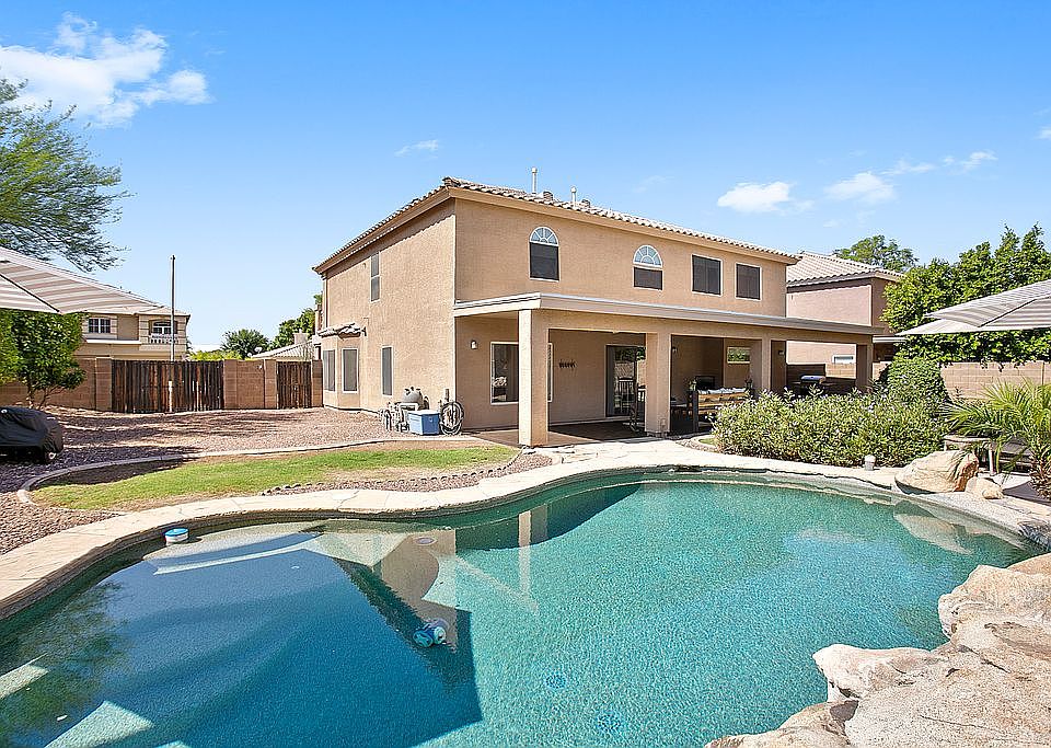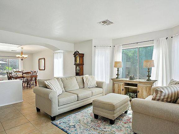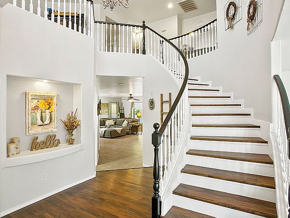 Fabulous home on a corner lot in the sought after neighborhood of Entrada Northeast. From the entrance door you are welcomed by The grand staircase which curves up to the second flood. Downstairs we are a formal living room and a dining room which leads to the large updated kitchen. The kitchen has white cabinets, and an island with corian countertops and built-in bar nook. Stainless steel appliances with French door fridge and double oven, microwave and dishwashers and pantry. Dining area with sliding door to back yard. This leads to the large family room. Laundry room with washer dryer hook ups and shelving leads to garage. Downstairs we have 1 bedroom and a full bathroom with tub and shower over. Up the curved staircase and it leads to the loft.