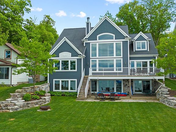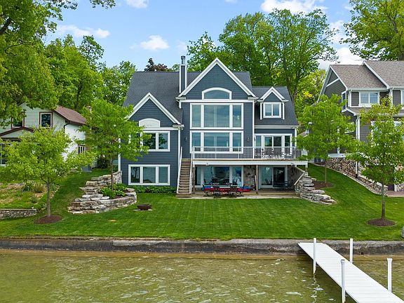 Amazing home on a wonderful level lot with 65' on frontage offering up breathtaking views on beautiful Lake Gage. The property is perfectly situated in the center of lake with a firm, sandy yet gradually sloping lake bed that reaches an ideal depth of 4-5 feet at the end of pier. It's an ideal swimming spot for all age groups and the spring fed water combined with the limestone bottom offers water clarity and colors unmatched in northern Indiana. Like new with over 4000 SF, this potentially year round home has 5 bedrooms & 4.5 baths. Awesome views of the lake from most all of the bedrooms & all of the living areas! Soaring 2 story ceiling in the great room flanked with the floor to ceiling fieldstone gas-started wood burning fireplace. The open kitchen with large island allows for easy entertaining. One bedroom suite is on the main floor with glass surround tile shower. Upstairs you'll find another bedroom en-suite along with 2 other bedrooms that share a Jack & Jill bath. The large upstairs bedroom currently can sleep 7+ people easily. Total sleeping capacity is 15+. In the lower level that walks out to the water with no steps down - you'll find yet another bedroom, full bath, large family/gaming area, along with a wet bar. The walkout is exceptional with the stone patio & boulder retaining walls showcasing the beautifully done landscaping. Do not miss the wine cellar with a 750 bottle capacity, each floor is a separate zone for heating & cooling, 220v hookup for future hot tub on walkout level, Sonos amps that run all of the built in speakers throughout the home will stay, heated tile floor in master bath, extra washer/dryer hookups in the unfinished space in the lower level. Beautifully landscaped with irrigation for both the main yard & the back lot too - This home is a dream come true. All of this & it has a massive (65 x 299) out lot across the road that is ideally wooded and irrigated to create a park like setting with hardwood trees and a perfect elevation to build a full size guest and/or carriage house. DO NOT MISS seeing this one of a kind home!