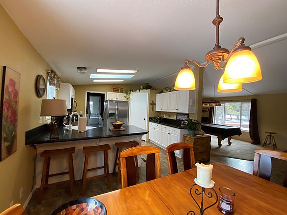 55+park. Beautifully remolded and move in ready home with all furnishings including pool table. New roof, flooring, heat pump, interior, exterior paint, lighting & fixtures + pellet stove. Bright and open kitchen with skylight, new counters and appliances. Great separation from large primary suite bathroom just redone also includes double vanities, oversized soaking tub plus walk-in shower. Extended deck and fence back yard. This home sits on top of the park. $680 monthly space rent includes water, garbage and sewer and snow removal. All occupants need background & credit check for park approval. NO SUBLEASE. Owner occupy only.
