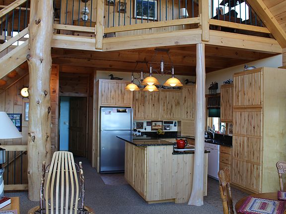 Nestled a quarter mile off the road, this large Chalet-style home sits on 12 acres. Built in 2002, this home has a stunning 360 degree view from decks and balconies. Some specialized features include knotty pine and cedar interior throughout, rustic maple kitchen cabinetry, granite counter tops and an open floor plan. The many windows and cathedral ceilings makes this one of the very best "Up North" homes new to the market. Fantastic views of Portage Lake, Onekama Marina and Lake Michigan. At just over 3,000 SF, and with three bedrooms and two and a half baths, this home will easily accommodate large family holiday gatherings. An upstairs loft/sitting area for outside viewing and the master suite also has a outdoor balcony. Additional features include; a grocery waiter between floors, new high efficiency furnace, A/C, natural gas, newer Owens Corning 50 year comp shingle roof (with transferable warranty), established & fenced garden, deer food plots, 12 x 20 ft. (double door) shed, 31 x 14 ft walk-up over garage attic, very large finished basement/ rec. room. Call seller to set up a private showing.