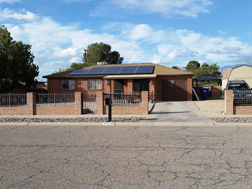 Adorable & affordable red brick home has comfort features with easy access to DMAFB & shopping. Spacious; playful enclosed rear yard offers a small garden with chicken coop plus extra storage sheds. Mature Fruit bearing citrus trees are abundant. Front yard offers block fencing for added privacy. No permits for enclosed single carport (no longer used as garage) - was already built when seller purchased. This has provided ''3'' small hobby; storage; or work rooms are HEATED and COOLED. Patio was enclosed prior to seller's purchase and does not reflect square footage. Solar panels on roof provide electric-buyer must assume and qualify.See attached info under DOCS or call LA/Seller for details. Great starter home or just downsizing.