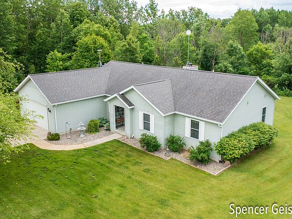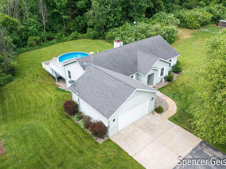 Less than a 25 minute drive to GR and just .4 mile off the M44 pavement is this 4+ bedroom, 3.5 bath walkout ranch off nestled within the woods of a 6.47 acre parcel with a 24' round AG pool and a 40x40 ''oh wow'' pole building! 2,888sq' of finished living area provides you with a main level living area with wood burning fireplace, master suite with tray ceiling and spacious master bath and jetted corner tub, lower level 4th bedroom and office or 5th bedroom, family area plus rec room with wet bar across from sliders to patio and pool. Additional amenities: IG sprinkling, generator ready, water treatment system and seller indicates excellent wifi service with MichWave! Take a walk down the mowed trails to enjoy the nature of the property and visit the 2 included deer shacks ready for Nov!