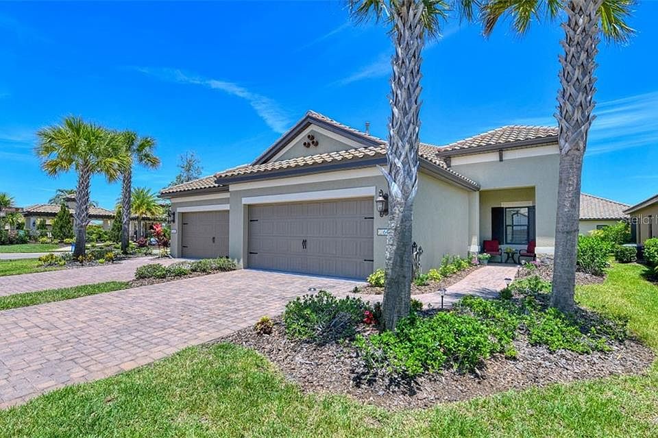 Simply put - you've earned it! Luxe Florida living in a resort style maintenance free-community, modern and move-in ready and close to everything! This pristine and inviting 2017 Tidewater villa offers the feel of a designer home - with a crisp, open floor plan and tropical views - with minimal upkeep. This 2 bed/ 2 bath villa includes a flex space that can serve as a den, study, workout or tv room. Your inner chef will be inspired with this knockout kitchen's upgraded stainless appliances, gas cooktop, stone counters, subway tile, undercounter lighting and a center island. Open to the dining and living areas - you can host intimate dinners or invite a crowd. Enjoy your coffee or a cocktail on the extended, pavered lanai complete with gas for grilling. The master suite is private and spacious with walk in closets, dual vanities, separate shower and stone counters. The second bedroom has a walk-in closet and ensuite bath. You'll enjoy the separate laundry room and 2-car garage complete with sink and storage. The details are evident - crown molding, window treatments, oversized diagonal tile, custom lights and fans, tray ceilings, Ring doorbell, keyless entry, tile roof, hurricane shutters. Relax in this peaceful, gated community of 92 villas with a resort pool. Spa, cabana and outdoor kitchen and tv. No CDDs! $322 monthly maintenance covers lawn, gate, amenities, exterior and roof. Enjoy all that Sarasota has to offer as you're minutes to SRQ airport, beaches, UTC Mall, shopping, restaurants, hospitals & I-75
