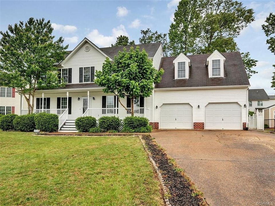 Spacious two-story with five bedrooms and three and a half baths, two master bedrooms! Country front porch overlooking cul-de-sac setting, rear deck overlooking the fenced back yard with detached storage shed. Attached two-car garage is currently used as a finished recreation room. The home has lovely marble and tile flooring, large eat-in kitchen with lots of cabinetry and sunny dining area with access to deck, great room with gas fireplace and two ceiling fans, formal dining room, and half bath on the main level. Upstairs has two master suites both with tile baths, three additional bedrooms, hall bath and laundry closet.