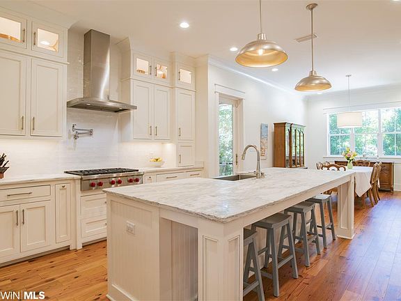 Well appointed newer custom home on approximately 1 acre off Main Street in Daphne with deeded bay access. This home has quality at every turn, with abundant light and windows, 8 ft interior doors and neutral paint. Large inviting front porch with stained tongue and grove ceiling. Step into the grand foyer with soaring 2 story ceiling. Engineered heart pine floors throughout the living areas and master bedroom. The vaulted living room has a stunning stained and milled reclaimed barn wood ceiling, built-in cabinets, bookshelves and gas fireplace. The gourmet chef's kitchen boasts Alabama white marble, Wolf appliances, Subzero side by side, double ovens, under counter drawer microwave and SS farmers sink in the vast center island. Custom white cabinets throughout. The open floor plan makes this home an entertaining dream; guests can visit in the open kitchen, dining and living areas. Also, there are two screened porches; one off the kitchen/master suite and one off the living room plus an outdoor grilling porch and patio. This home has a main floor office, additional guest suite plus master bedroom downstairs. The master suite has french doors onto the screened porch, master bath w/ separate vanities, custom built-ins for extra storage, large shower with dual shower heads and body sprayers plus a spacious fully customized walk-in closet! Upstairs are two large additional bedrooms with a full bath in the hall, plus a bonus room that could serve as a den, study, or movie and game room, it is currently being used as an office. Tired of skimpy garages in newer homes? This finished over-sized three car garage boasts 1,042 sq ft and has a service door off the front porch. Home is built to gold fortified standards and is energy efficient. Great location - convenient to shopping and restaurants. Live on the Eastern Shore and commute to downtown Mobile in about 15 minutes. Come make this spectacular house your new home on the Eastern Shore. You don't want to miss this one!