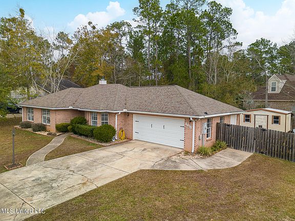 Quaint home must see home in the center of Diamondhead which features an open floor plan with vaulted ceilings and lots of windows for an abundance of natural light into the living room/kitchen/breakfast area. The double French doors and bay windows provide sunlight and views of almost the entire backyard. When you enter the foyer you can walk into the living room/kitchen or enter into the office/formal dining room. If you like closets, this home has plenty throughout the house including a coat closet in the foyer and linen closet off the living room. The primary bedroom is in the back of the house with windows overlooking the backyard. The second and third bedrooms are in the front with as separate bathroom. Laundry room is off of the kitchen and connected to the double garage that has a golf cart spot for parking and its own garage door in the side of the garage. The entire backyard is fenced in providing privacy and ample space for play. Yard offers a newly updated wood fence and three gates, one of which is a double gate. You will find a separate 11 X 16 workshop that has electricity run to it with lights and plug ins for your tools or crafts. The workshop is also carpeted and has sheetrock/insulation. This one won't last long. Schedule your showing today.