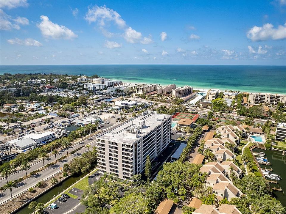 Beautiful Penthouse Condo with sweeping views of both the Beach and Bay! This luxury unit has been totally redesigned and tastefully updated. Luxury vinyl plank throughout, new water heater, a/c, appliances, quartz countertops, vanities, and refinished cabinets with plenty of storage. Split floor plan offering privacy to guests. Large balcony is the perfect place to enjoy your morning coffee or a cocktail and overlook the beautiful blue water and white sand of Siesta key or the Bay. Balcony has 3 access points from the primary bedroom, living room, and guest bedroom. Balcony has just been retiled. Interior laundry room. Not planning to use it full-time? Sign-up for the excellent, low-cost, on-site Rental Program that allows income-producing one-week rentals, 52 times per year. Great amenities include Deeded Beach Access, Boat dock with access to the Bay, a Heated Olympic-Size Pool, three lighted Tennis Courts, Pickleball, an Exercise Room, his and her Saunas, Clubhouse, BBQ grills with Bay Views, lighted Shuffleboard Courts, Basketball. Beach access for The anchorage is located just across the street and is a short walk to restaurants, shops, the market, charter boats, etc. Take advantage of the free trolley service to Siesta Key Village to explore other shopping, dining, and entertainment options. Call for your private showing!