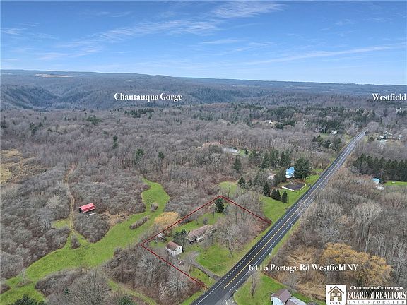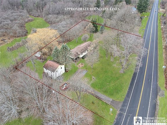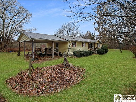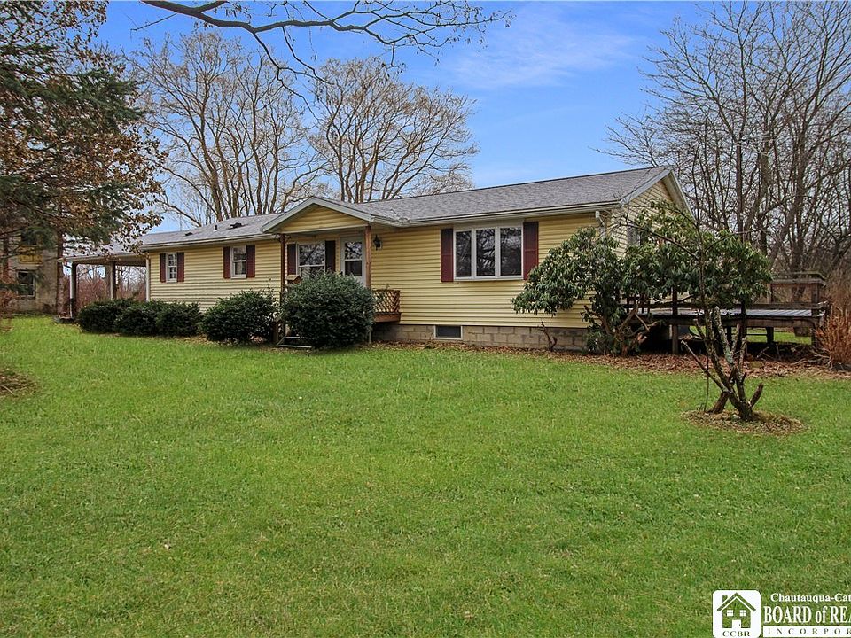 Three bedroom, 1.5 bath ranch on almost one and a half acres. From the driveway, there is a entrance with deck and sitting area covered by a 20x24 canopy roof, or an additional entry with small covered porch. Entering through the door under the canopy, there is a laundry/mud room and a 1/2 bath. Proceed into large kitchen with lots of cabinets and counter space. Living space is very open with dining area passthrough to sizeable living room with bump out window and sliding glass doors out to a deck overlooking the large lawn. The other side of the home features three bedrooms all with large closets. Nice large basement with high ceilings and a walkout through Bilco doors. Lots of storage in garage with second story and an additional outbuilding. Trees line the hill between the house and road offering privacy. Great location between Chautauqua and Westfield; it's just a ten minute drive to Lake Erie and Lake Chautauqua. Westfield mailing address, low Chautauqua Lake taxes and schools, new well.