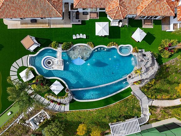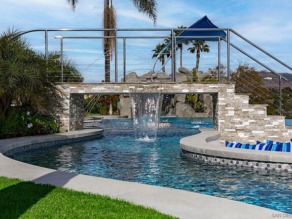Your personal PARADISE AWAITS w/incredible year-round Sunset Mountain & Lake VIEWS at this 4-acre Luxury Haven, most prestigious guard-gated 24/7 within exclusive Rancho Del Lago in the Rancho Santa Fe School District. Where leisure meets grandeur, this 6+ bedroom estate that is in its original 1989 interior & is waiting for the Buyer's remodel. The exterior has been totally rebuilt with expansive wood pergolas, offering the perfect retreat for family gatherings overlooking the Tennis Court & Sports Field. This property is a canvas for family adventures. Picture the delight as your family swings away in the batting cage w/ a pitching machine, dribble on the basketball court, and create memories on the soccer field. Recharge along the walking path, surrounded by a meticulous curated landscape featuring cedar vegetable beds, grape vines and berry patches. Hone your putting skills on two greens tailored for precision. The saltwater two-level pool becomes your aquatic sanctuary, where every splash is a memory in the making featuring a thrilling slide from the top of the grotto down to the lower pool promising endless laughter and excitement for the whole family. Drift along the lazy river, while a central fire pit within the inner circle creates a cozy island accessible by a charming bridge. Tech-savvy amenities abound, with Wi-Fi controlled lighting, fountains, waters and more. As the sun sets, watch the magic unfold as the landscape lighting transforms your surroundings into a serene yet powerful atmosphere, highlighting the lush greenery and breathtaking VIEWS! Welcome