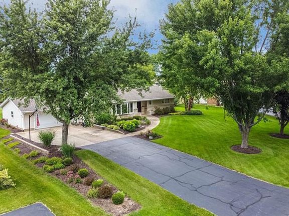 What a beauty, nestled in a smaller subdivision with easy access to schools, shopping & I-90 on half acre lot. Super curb appeal, a very well maintained ranch style home with established easy care landscaping. Gleaming Hardwood flooring flows from the large entryway foyer through the first floor of the home, a combination living room and dining room with a display case built-in. Update kitchen with granite countertops, breakfast bar, tiled flooring, open to the cozy family room with full stone fireplace and side builtins The primary bedroom ensuite features a step in shower. Sliders to the large deck with Pergola over the patio enjoying the back treed lined yard. Main floor laundry room. Full basement with lots of potential, there is a room with french doors that would make a neat office, workout room, lots of storage. This is a warm, inviting light and bright home.