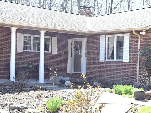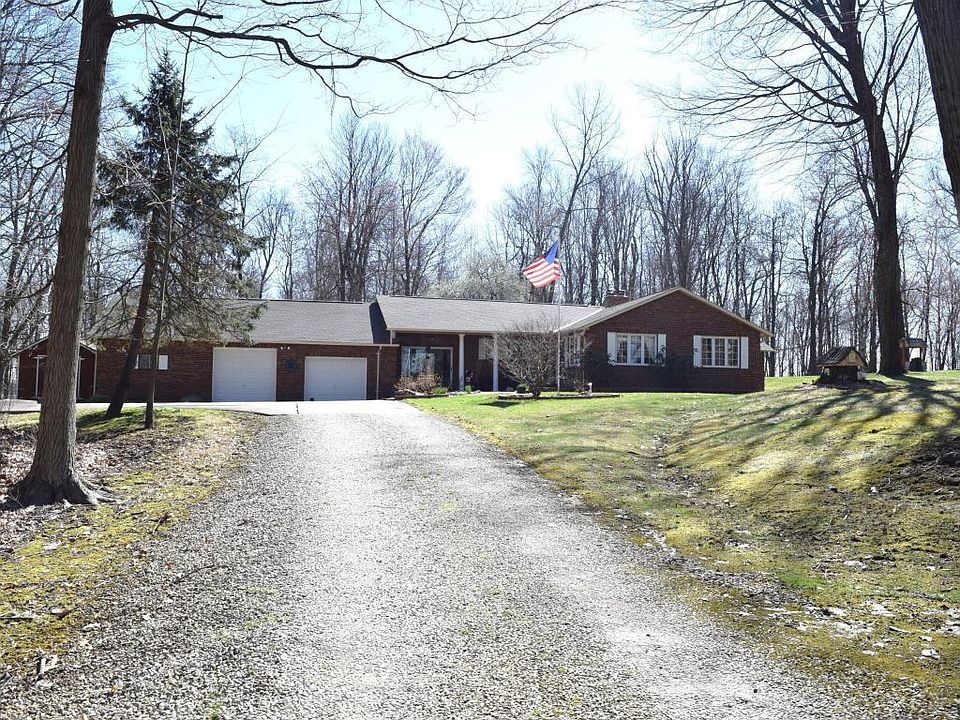 Sprawling Ranch on 5 Wooded acres & park like setting! 4 spacious bedrms, Huge Kitchen w/great counterspace & maple stained cabinets, tile flooring & tons of natural light throughout! Brick fireplace in Living room w/Heatilator, & Lam.Wood Flooring throughout many rooms, French doors lead into Formal Dining /Office, Oversized Mstr Bedroom...All Rooms Spacious! Both Bathrooms have been updated, great closet space throughout too! Florida room/Breezeway to enjoy & relax. 30x40 attached Garage is car lovers dream w/ electric & water and space galore. Front & back covered patios to enjoy all times of day/evening, Walkout Basement includes the 2nd fireplace with space for possibility of additional living and/or storage! New Roof 2011, Well 2014, Furnace/AC 2011. Beautiful + Convenient Location!