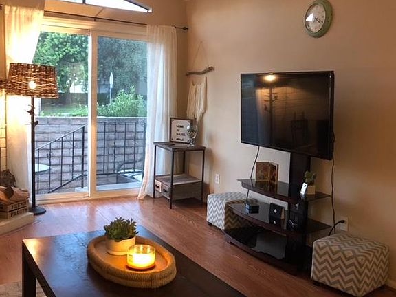 Clean and quiet 2 bedroom condo, lots of privacy, Features include Garage parking, Central A/C and heating , Fireplace and inside laundry. newer interior paint, wood like flooring. Appliances include washer & dryer, stove, dishwasher, fridge and microwave. complete with it's own private front and rear yard/patio space with mountain views. Small dog or cat considered with approval and additional deposit. No adjacent neighbors above or below. Owner pays Sewer, Trash and HOA fee.