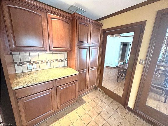 Built in bookcasesVaulted ceilingBuilt in barCustom inlaid tile floorLevel backyardUnder cabinet lightingCustom cabinets