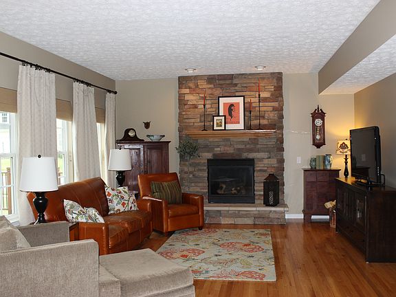 This gorgeous custom home has many upgrades and updates! The Exterior Stone Facade and professional Landscaping, Glass storm door, and exterior freshly painted doors greet your guests in style. Wonderful real hardwood flooring throughout the entire 1st floor is a great feature, along with the floor-to-ceiling gas Stone fireplace in the Great Room. There is recessed lighting, along with upgraded oiled-bronze lighting throughout the home. The Kitchen includes upgraded Mocha glazed maple cabinets that are extra tall. The under cabinet lighting and recessed lighting is a great feature. The bathrooms have ceramic tile flooring along with upgraded Espresso cabinetry and new faucets, mirrors, lights and fixtures. This home sits on the desirable neighborhood of Lexington Farms, right across from the GlenOak Community Campus.