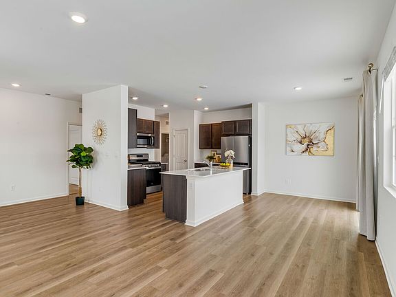 This newly built ranch-style townhome offers 2 bedrooms, 2 bathrooms, and impressive 9-foot ceilings plus an immediate move in date. The open-layout living room, kitchen, and dining area provide a bright, welcoming space that's perfect for gatherings. The kitchen is equipped with stylish cabinetry, stainless steel appliances, a pantry, and a large island with room for seating- plus a new washer and dryer. Relax in your own private retreat-the spacious primary bedroom with an en-suite bath featuring raised-height dual sinks and a walk-in shower. Community provides snow removal and lawn care-- plus access to other amenities like the community pool!