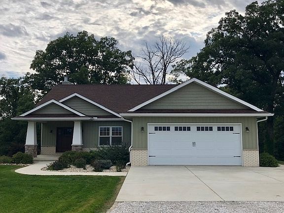 FANTASTIC 2014 Stegmeier built ranch on 5 acres PLUS 25x50 beautiful red outbuilding w/(2) 14' overhangs. PEX in floor for future heat, 200 amp service, upstairs 20x24 office plus storage! Gorgeous Hickory wood floors & open floor plan. HUGE kitchen w/breakfast bar/seating for 5, Professional series appliances, subway tile & walk in pantry. Great room w/woodburning fireplace w/TV mount & sliders to covered deck overlooking wooded ravine. Full walkout bsmt. ready to finish, plumbed for bath. South wall lined w/daylight windows & Andersen sliders to patio. Add'l 40 acres available for $185,000.