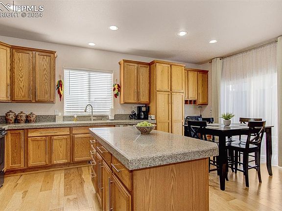WELCOME HOME!! Pride of ownership shows in this meticulously maintained and cared for 4BR, 3 BATH, 2 car spacious rancher located in a quiet neighborhood close to multiple parks. Instantly feel at home the moment you step inside. You are immediately welcomed into a formal dining room/family room with stunning hand scraped hickory wood flooring that runs throughout most of the main level. Beautiful open kitchen includes soft-close oak cabinets, upgraded Granite Transformations countertops and newer SS appliances. The Master suite has an attached 5-piece master bath and walk-in closet. Two more spacious bedrooms, laundry room, and another full bath complete the main level. The finished basement encompasses the 4th bedroom, full bathroom, family room, and "other room" (easily converted to a 5th bedroom with the addition of a closet). A huge storage room and separate utility room with HVAC and water softener complete the basement space. The backyard has a large concrete patio for those summer BBQ's, low maintenence landscaping, sprinkler system, and a TuffShed for storage. Close to Powers corridor, various shopping, hospital, schools and don't forget Peterson and Schriever Air Force Bases.