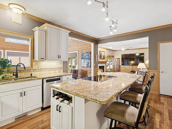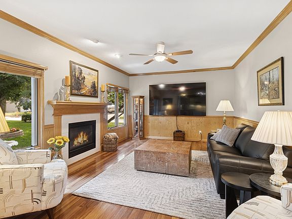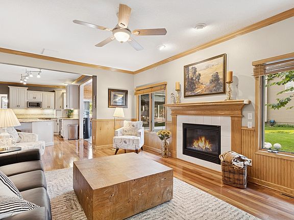 Gas fireplaceWet barFinished basementOpen layoutUpdated half bathMature treesCorner lot