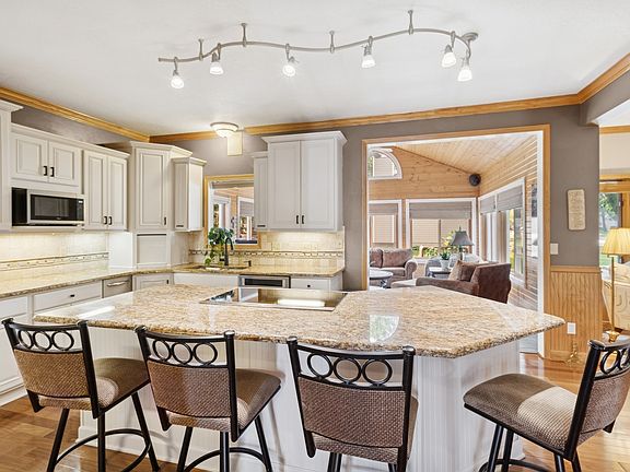 The spacious kitchen boasts custom cabinets, granite countertops, large island, and stainless steel appliances—including double ovens (one convection), refrigerator, microwave, dishwasher, and trash compactor. Relax year-round in the 4-season sunroom with tile floors and radiant heat. The main floor also includes an updated half bath, a cozy family room with gas fireplace, and formal living/dining rooms with new carpet.