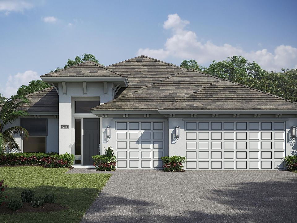 Experience elegant coastal living at its finest with our popular Cordella Jem floor plan. Boasting a comfortable 1899 sq. ft. of living space, this home offers 3 beds, 2 baths and a spacious 3-car garage. The home includes PGT impact glass windows and an added transom window in the dining area. The gourmet kitchen features an upgraded GE Profile Gas 5 burner cook top, GE Profile microwave/ convention oven combo, GE Profile French door refrigerator, stainless steel hood, upgraded white cabinets adorned with soft-close and dovetail finish, crown molding, quartz countertops, and a captivating backsplash. Additional upgrades include stunning level 4 quartz Kitchen countertops, wood-look tile flooring throughout, a transom window in the dining room, coffer ceiling in the foyer and the Island exterior elevation.