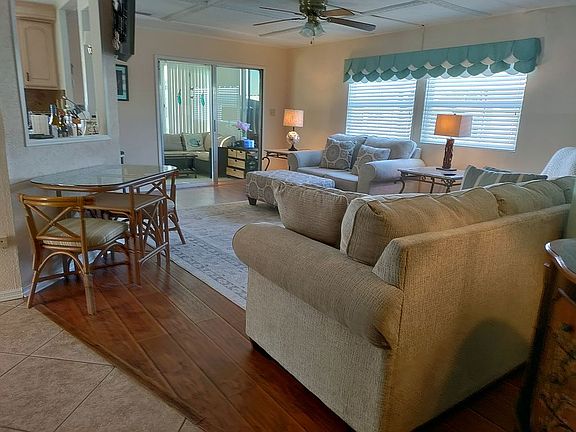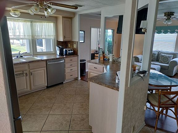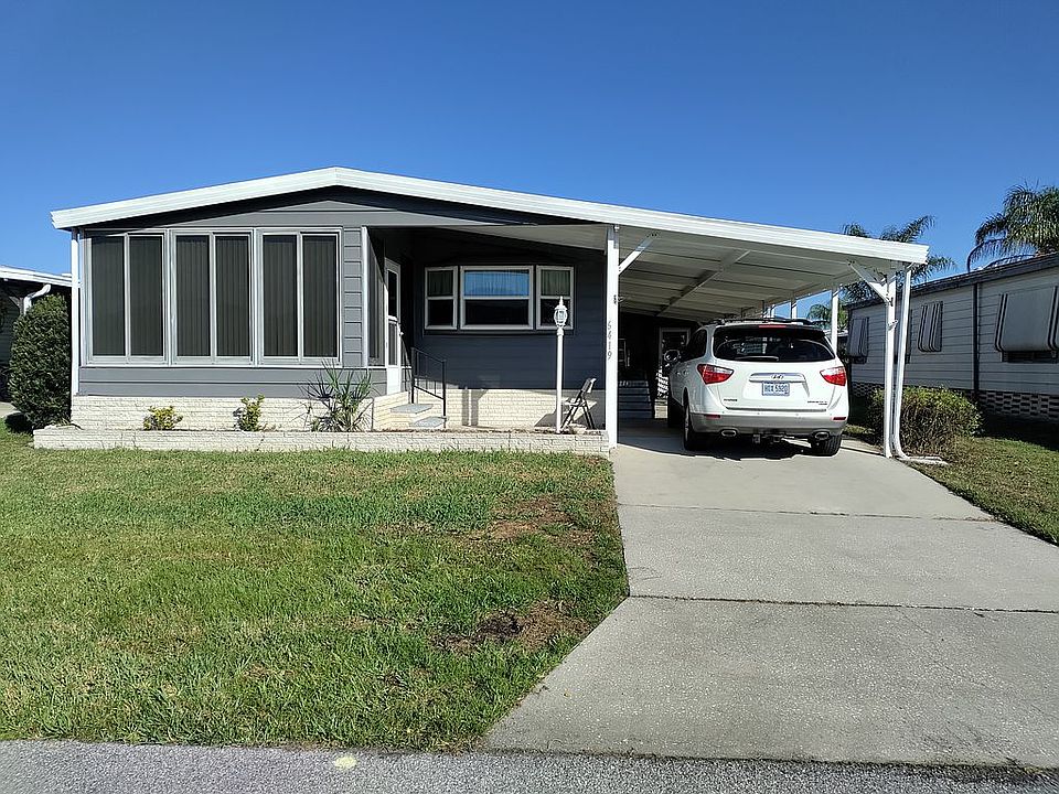 Double wide mobile home on DEEDED LOT (no need to rent the lot), updated and offered fully furnished, second home from beautiful community pool and clubhouse, 2 miles west of SR 27 on SR 544. Fully updated kitchen with tile floors. Located in the Brookhaven Mobile Home Park within the city limits of Winter Haven, Florida, so street and drainage maintenance costs do not fall on the Brookhaven HOA. New 3/4" T&G plywood subfloors in living room and master bedroom. Tiled floors in kitchen, dining area and master bath with walk in shower. Newly painted gray exterior 2021. Package unit heat pump. New water heater. New Veranda Coolaroo Sun Shade. New Stainless Steel Samsung frig, french door, bottom freezer with ice maker. Front Florida Room with central A/C, and new solar screening on south (front exposure). Covered carport 48 feet long. Zero lot rent. Open floor plan. House is in GREAT condition - ready to move in - FULLY FURNISHED!