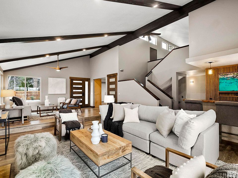 Beautiful and private 4 bed home with additional bonus space, loft, bars, and sauna sits at the end of cul-de-sac in the desirable Meadowridge community. Inside you are greeted with high ceilings, updated luxury vinyl plank flooring, new tankless water heater, newer furnace, and an open floor plan with primary suite and additional bed and bath on main level. Dedicated 220 outlet in garage for a Tesla charger. This beautiful home lends itself easily to entertaining with multiple outdoor living spaces., Enjoy the outdoors with low-maintenance living with artificial grass, covered patio, freshly-painted deck with custom awning and hot tub while taking in the gorgeous views and mature landscaping! Home backs up to walking trails, creek, and open space maintained by the HOA. Also take advantage of the pool, clubhouse, and tennis courts of the Meadowridge community in this fabulous Southwest Reno location near many shops, restaurants, and Bartley Ranch Park. Please click "unbranded virtual tour" to see video of home.
