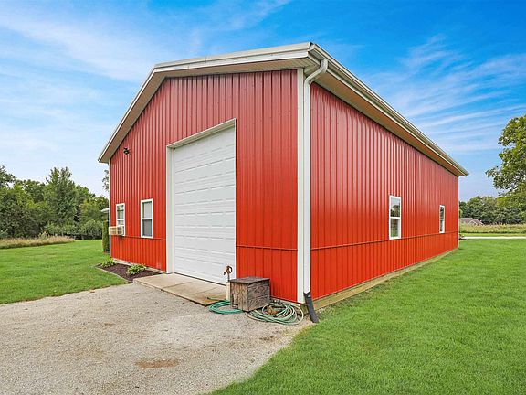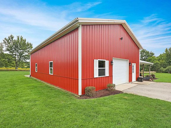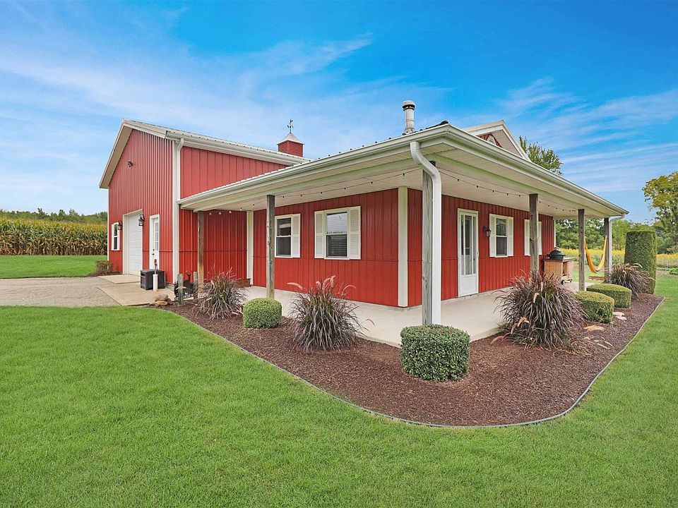Welcome to your own little piece of paradise. Serene, quiet and private...this unique post frame home sits on 3 acres. Just over 1000 square feet of finished living space, this home has 2 bedrooms and 1 bath. Enjoy the open concept living room and kitchen area, the extra large laundry room and the private office attached to the master bedroom. The garage area features a loft for storage, a custom built work bench and extra tall garage doors perfect for your motorhome! The beautiful grounds are partially wooded and has a garden area, pear trees and raspberries. Relax on your wrap around porch!
