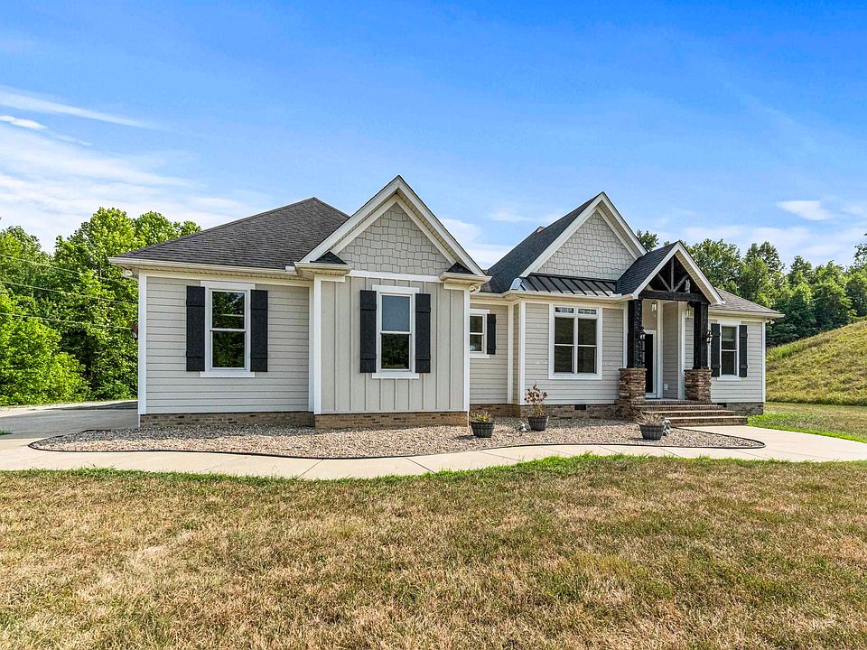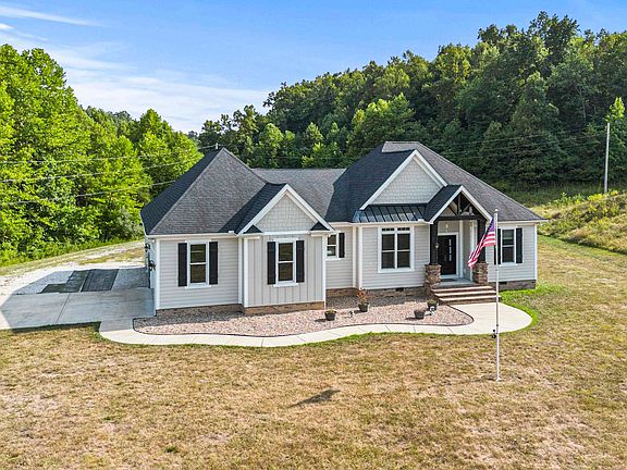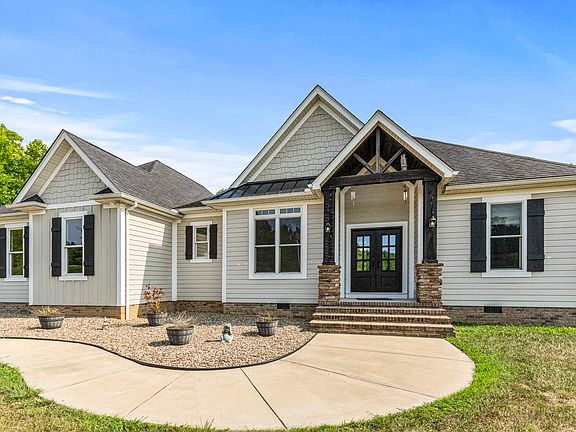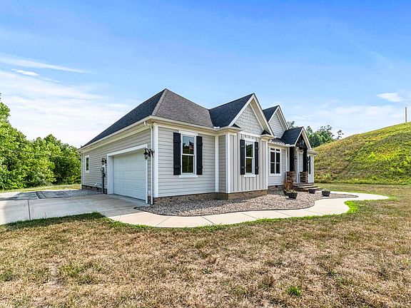 Welcome to this lovely one-story, 3-bed, 2-bath farmhouse built in 2018, offering the perfect blend of modern amenities and charm. Set on a mostly level 11.45 +/- acres in Campbell Lane Estates, this property provides privacy but in close proximity to all local amenities. The double entry doors lead into into a spacious floor plan where the living room, kitchen, and dining room are open, boasting beautiful wide plank engineered hardwood flooring. The open living area features a beautiful stone finished fireplace with a wooden mantle and gas logs. Just off the living room, a bonus room can be used as an office, playroom, or whatever suits your needs. This flexible space includes a closet, allowing it to be easily converted into a fourth bedroom, if needed. The kitchen showcases beautiful wooden Kraft cabinets with granite countertops and a brick backsplash, a stainless fridge, a stainless gas stove with double oven, and recessed lighting. The kitchen island contains a stainless apron front sink, a stainless dishwasher, a spot to put a microwave. A large walk-in pantry completes the space. Conveniently located next to the kitchen is the dining area, which provides access to the covered back porch leading to a concrete patio.. The master bedroom features a high ceiling with a shiplap design, including sliding barn doors into the master bathroom, complete with a soaking tub, a tiled shower, double vanities, a water closet, and a large walk-in closet with a chandelier. The entire master bath is accented by patterned black and white floor tiles. The mudroom hallway area, features a beautiful chandelier and herringbone brick tiled floor. The laundry room includes upper and lower cabinets for storage, a fold-out ironing board, and comes equipped with a washer and dryer. The garage is equipped with LED lights, a closet with furnace, a pull down ladder with stairs for attic access. The 2 additional bedrooms with deep closets are located on opposite side of living area With the second full bathroom, featuring white hexagon floor tiles, a pedestal sink, and a modern shower/tub combo, Other outside features include a fenced area of the backyard idea for pets or play area for small children to roam, a storage building, a 50-amp RV hookup plug and parking, 2 apple trees and an oak tree out front, a sealed crawlspace, and ample parking space. The flat land behind the home offers plenty of space for an additional garage, barn, or swimming pool if desired. Schedule your showing today!