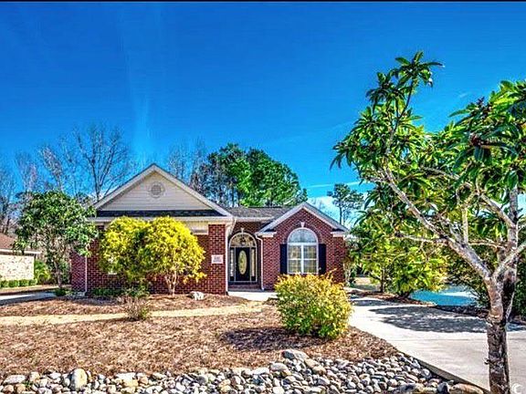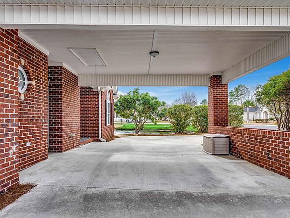 Beautiful Low-maintenance custom-built All brick home in the sought-after Colonial Lakes community is a must-see! This is truly a one-of-a-kind property with features and details unmatched by other builds. Illuminated by natural light due to the quantity of windows with peaceful views of nature from every room. located next to a community pond and fountain which can be seen from the dining room, one bedroom, the living room and kitchen. French doors lead from the dining room and master bedroom to the two separate covered porches to enjoy the tranquil sound of the pond and natural surroundings. The home features high ceilings, palladium windows and cathedral pitches that give the property a large open feel. The property received a new dishwasher Feb 2024, New Roof 2023,Water heater in April 2023 and Hvac replaced in 2021 which gives extra peace of mind. A carport with an expansive circular driveway gives plentiful space for guests and family members for parking needs. The backyard is bordered by a dry creek bed, eliminating worry about a home being built close to your property. Also, The street being a cul-de-sac will minimize busy traffic flow. This all-brick home is all on one level, making it perfect for those who prefer single-story living. With its prime location in a golf course community and proximity to the beach, this home is the perfect combination of beauty and convenience!