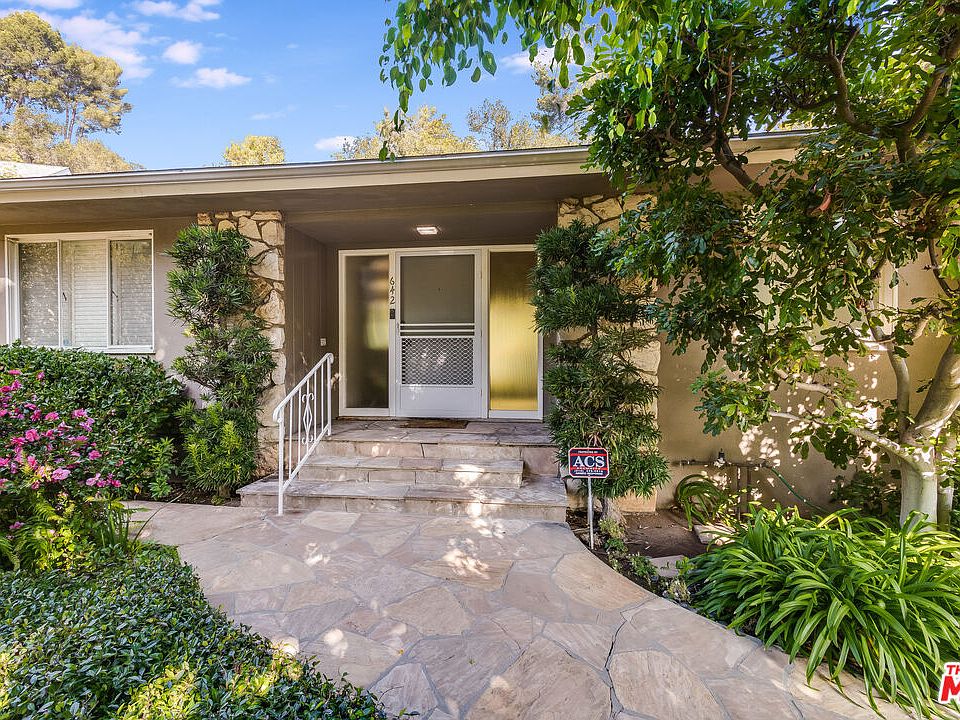Custom built mid-century home located just above Kenter Canyon Elementary School in Brentwood. Entry hall leads to large living/dining room with high vaulted open-beam ceilings, fireplace, and nice natural light. Sliding glass doors open from the living room to a brick patio and private yard, allowing for the California indoor/outdoor living experience. The kitchen needs to be updated but it is large with an eating space and laundry hook-ups. To the right of the entry hall is the primary bedroom with an en-suite bathroom and lots of closet and storage space. Two more generous sized bedrooms with wardrobe closets and a full bathroom complete the sleeping area. There is a double car, attached garage with direct access to the house. Both the front and rear yards are nicely landscaped with mature trees and shrubs. First time on the market and the property is being sold by the family trust. The home needs updating but the design is sensible and solid and the lot is nearly flat making for a great opportunity for a new owner to remodel, expand, or build new.