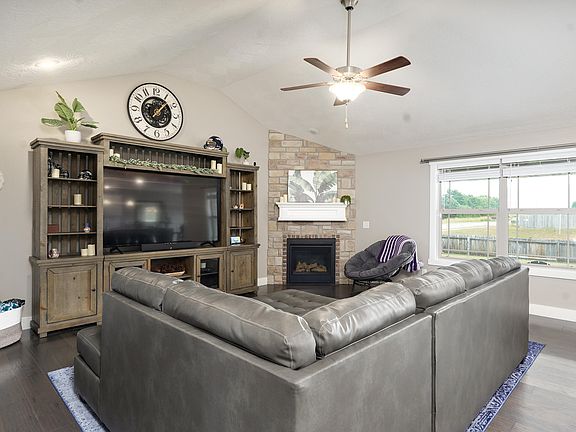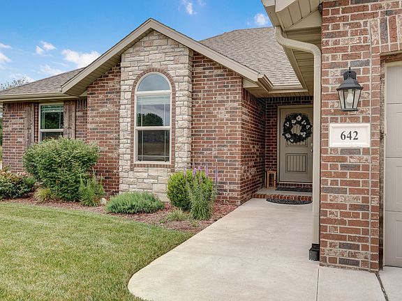 ALL BRICK, one level home in Nixa featuring 4 bedrooms with a great location in the Eagle Park Subdivision. You can enjoy an open floor plan with a beautiful lake view out of the back windows. The family room offers a vaulted ceiling and gas fireplace with stone surround. The kitchen features a very large island with additional seating and a separate pantry, the seller is including the Refrigerator in the kitchen with the sale. The huge master bedroom suite has new flooring which is an easy maintenance, wood look tile. Mosey on into the bathroom and see the double vanity sink, walk in shower, jetted tub and a large walk-in closet. So many features are found through this home including granite counters, a designated mud room with bench seating, utility closet to free up space in the laundry room, coat closet, linen closet and spacious bedroom closets. The backyard is fully fenced with a wooden fence that transitions to a 4' height to enjoy the lake view from your large covered patio and a fully irrigated yard. Built by Bussell, and only 4 years old, you will love this home and the contemporary feel of it!
