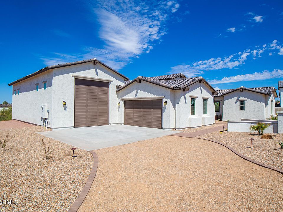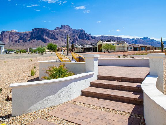 Fully finished, Quick Move In home. Ultimate RV Garage: 47x23 fully finished RV garage, completely insulated, 14 ft tall door, 16ft ceilings, floor drain, hose bib faucet, and an upgraded electrical package with 400 amp service, 50 amp outlet; over lit with multiple fixtures. Bring the Bus, the Boat, the side by sides, and still have room for a workshop or home gym! Arroyo Vista Estates, a gated community of 26 semi-custom homes with unforgettable views of the Superstition Mountains. Fantastic 1 acre lot. Modern light desert toned colors, this single level home has something for everyone! Three bedrooms plus open den. Extensive tiled flooring, 42'' cabinets with full height backsplashes, and more! Fully landscaped front yard, and fenced, leveled rear yard all included. waterfall kitchen island, the extremely popular Calacutta Maywood quartz counters, Samsung appliances including wall ovens. Baths have tiled showers surrounds with a custom design. Spectacular setting! Includes front yard landscaping, paver walks, courtyard and more!