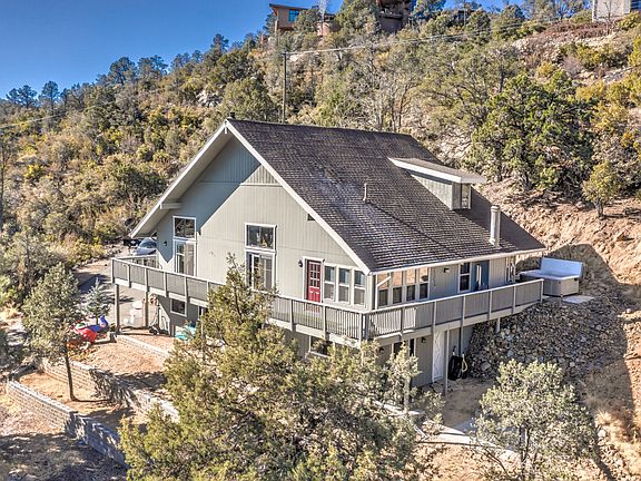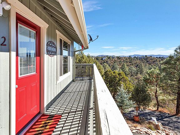 Hard to find rustic home with amazing panoramic views only 3 miles from Downtown Prescott! 1/2 acre lot allows space and privacy. Main level features large great room with new wood burning stove, vaulted beamed ceilings, and sliders to enjoy the spectacular views, spacious open kitchen, and large master bedroom with fireplace, remodeled bathroom, plus an AZ room. Upstairs features two large guest bedrooms with a updated Jack & Jill bathroom. New laminate & luxury vinyl flooring throughout. Lower level not included in square footage has a guest bedroom, bath, laundry, and 1 car garage for workshop and toys. Enjoy the amazing views from the wrap around deck or relaxing in the hot tub. Brand new HVAC! All appliances included. Plenty of parking including RV's. Great vacation or full time home.