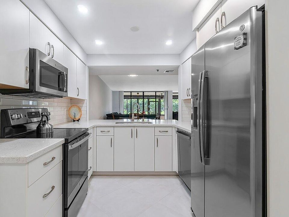 Gated community, The Glens in central Boca Raton. 2 Bed + Den, 1582 liv sqft unit with 3 balconies, golf course view. 1st floor entry with parking spot #237 easily accessible. Completely updated Corner unit w large 24'' porcelain tile on diagonal thru-out. Kitchen offers new cabinetry, quartz counters, new SS appliances, subway tiles. Split floor plan for privacy. Baths completely remodeled w new cabinets, lighting, flooring,showers & dual sinks in primary bathroom. Laundry located in its room w Maytag Washer/dryer. Closet systems. Located near the clubhouse for fitness, pool, pool grills, sauna. Association fee includes, water, cable, internet, lawn,roof, insurance: (Breezeline Stream TV + Internet.) New roofs done, concrete restoration in progress. Seller is paying the assesment!