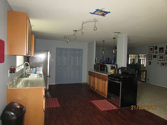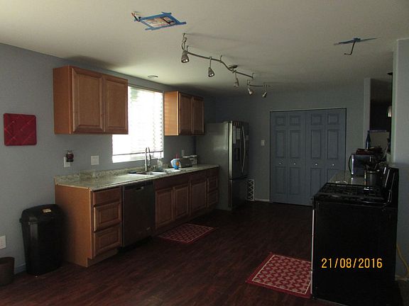 Five acres with 1800 sq ft triple wide manufactured home, garages and workshop! This home has been almost completely remodeled. There are some unfinished touches and some finish work needed on exterior but it has a great open floor plan and beautiful kitchen cabinets, newer carpet, laminate flooring and a great location! Large windows to take in views and new exterior and interior doors. All new supply plumbing and recepticles. Fenced and some shelter for horses. There is plenty of room here to do whatever you desire.
