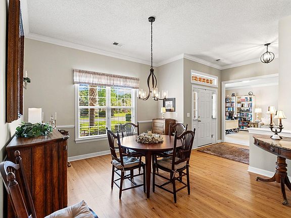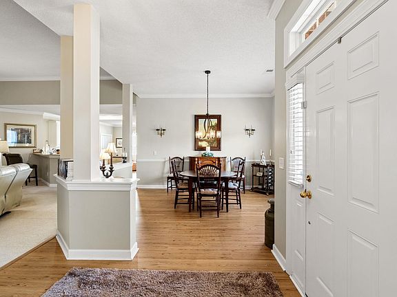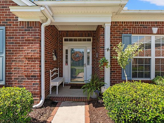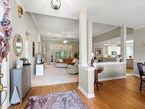 Set on a beautifully landscaped lot with mature trees and peaceful views of a spring-fed lake, this move-in ready 3-bedroom, 3.5-bath ranch-style home (with a flexible office or optional 4th bedroom) offers the best of refined, low-maintenance living in a sought-after golf course community with ultra-low HOA fees. Step inside to a thoughtfully designed split-bedroom floor plan featuring two private suites—ideal for ultimate privacy for multigenerational living or guests. The primary suite is a serene sanctuary with French doors leading to the Carolina room, dual walk-in closets (one truly massive!), and a spa-like en-suite bath that will wow: elegant tile flooring, deep soaking tub under a chandelier, granite double vanity, a beautifully tiled walk-in shower with bench, full-body shower panel with rain head and wand, private water closet—and did we mention the second walk-in closet? The second suite also shines with its updated bath, sliding barn door, water closet, marble vanity, glass-enclosed walk-in shower and a large walk-in closet. Entertain or unwind in the expansive living room with soaring 12-foot vaulted ceilings, a cozy gas fireplace with marble hearth, custom built-ins, and French sliders that open to the bright, airy Carolina room with Eze-Breeze windows—bringing the outdoors in, year-round. A formal dining room flows into the oversized kitchen—perfect for hosting or daily living—with solid oak cabinetry, stainless steel appliances, a brand-new butcher block island (2024), breakfast bar, pantry, and a spacious laundry room with garage access. Every inch of this home exudes quality and comfort, with crown molding throughout, a spacious 2-car garage (with utility sink, built-ins, and attic with pull-down stairs), and numerous upgrades including: New hot water heater (2020); Upgraded quality roof (2018); Leaf Filter gutter system (2019); Stained concrete driveway & garage floor (2020); Enlarged & sealed back patio (2023); Outdoor uplighting (2022); and Full-yard irrigation system. Enjoy resort-style amenities including a community pool, pickleball courts, and clubhouse. This move-in ready lakefront gem offers a rare blend of elegance, space, and value—don’t miss your chance to call it home. Square footage is approximate and not guaranteed; buyer or agent to verify.