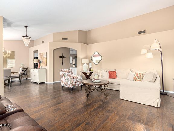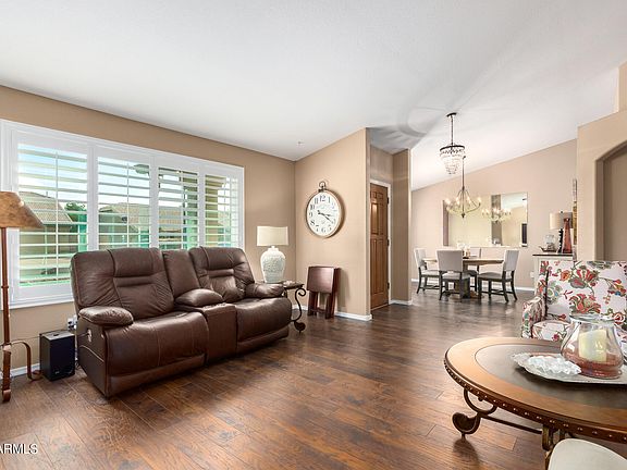 Look no further!This fabulous 3 bed, 2 bath single level Ranch style home in North Mesa is the one! Golf Course Lot AND Mountain Views in a Non-HOA neighborhood. The front is low maintenance, extended sidewalk and front patio area to enjoy our wonderful weather. Come inside to discover an impressive home. Separate living & dining area showcasing a designer palette, wood-look Classen laminateboden flooring (Color:Tisdale) throughout (except tiled bathrooms) vaulted ceilings, and 3'' White plantation shutters. Planter Shelves. Two new front vinyl Low E windows. Pass under the archway to find the Large Open Kitchen with White cabinets, Granite countertops, extended cabinets with butcher block top below two floating shelves, breakfast bar, spacious storage in walk-in Pantry. Plumbed for GAS cooking behind the stove. Family room has an electric fireplace (can be converted back to wood burning, if you prefer.) The family room has sliding glass doors to walk onto the covered patio to see over the low view fence towards the plush green grass of the 9th hole of the Painted Mountain Golf Course. Looking up from your kitchen, Family room and tiled back patio there is a fantastic view of Red Mountain. There is a different angle of the yard and you see Painted Mountain and another nearby mountain top. Primary bedroom features a shutter covered bay window with the view of the golf course and Red Mountain right from your bed. Primary bathroom features a private tiled walk-in shower with staggered glass blocks, dual sinks and a walk-in closet. This is a split floor plan with spacious secondary bedrooms. The hall bathroom is completely updated with a shower that has a glass slider and gorgeous vanity. Both bathrooms have high rise toilets. New roof underlayment 11/2022, brand new water heater 11/2022 and Re-piping of the plumbing 11/2022. Low View fence will be changed out 11/2022 and will be a Navajo white verses the black fencing in the photos. Fresh exterior paint 2021, 2 car garage with a new garage door in 2021. The garage floor comes with the Red and Black checkered vented Racedeck snap mat to cover the garage floor. This is a well kept Non-HOA subdivision conveniently located near the Red Mountain 202 Freeway, restaurants, gas and multiple grocery stores.