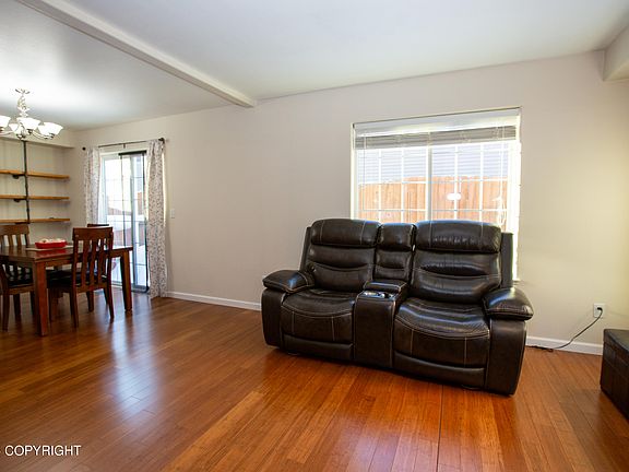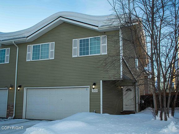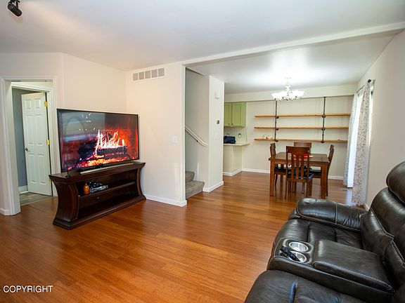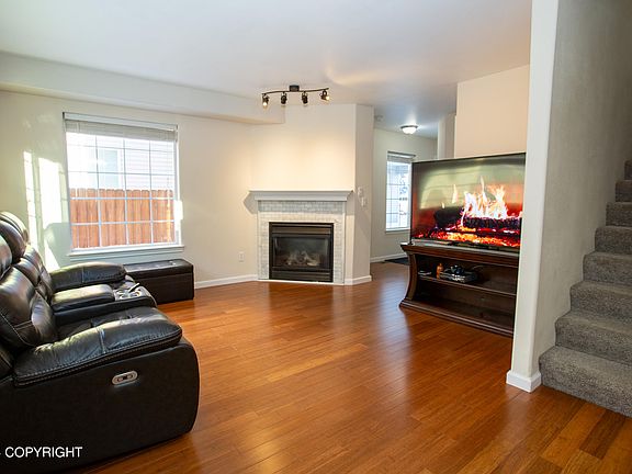 Custom townhome-style condo close to JBER. Upgrades include gorgeous real hardwood bamboo flooring, newish carpet and all new interior paint. Brand new fridge, stove/oven, microwave, dishwasher, washer/dryer and water heater. Large master suite with walk-in closet and master bath. Remaining two bedrooms are spacious and will include two flat screen TV's. Other amenities include gas fireplace,half-bath on main level, tiled backsplash, small private fenced backyard for BBQ's and pets. All bedrooms on one level, large loft or second family room. Heated 2 car garage. HOA allows up to 2 domestic pets with no weight restrictions.