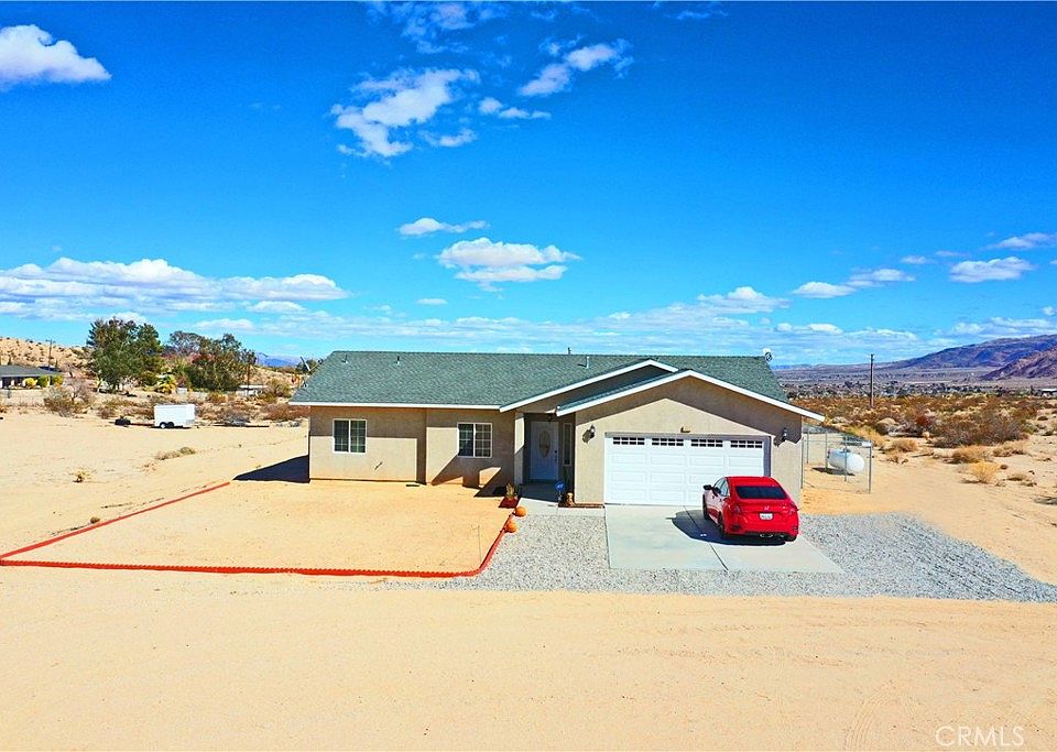 Location, Location, Location....Truly exceptional, the functional floor plan features an inviting interior that is bright and sunny and features generous living spaces. This 3 bedroom 2 bathroom is exactly what you've been looking for. Sized for comfort, the spacious main bedroom comes complete with a private bathroom double sinks a large closet. Guest bath has double sinks as well. Step out the front door to breath taking desert views. The fenced-in backyard features a great view and patio for soaking in the desert rays and gaze at breathtaking view. Tile flooring throughout, carpet in bedroom. Double garage, laundry in garage. Look at your front door to a desert play ground. A place where wonderful memories are made. Just minutes from the Joshua Tree National Park and local favorites: Farmers market, casino, golf course, and Campbell Hill Bakery. Your search for the finest rural living is over. In a scenic quiet spot located in the peaceful Twentynine Palms neighborhood of Harmoney Acres over an acre lot but seems like more. Be prepared for 'love at first sight'. Early viewing is recommended. Don't let this desert gem slip by.