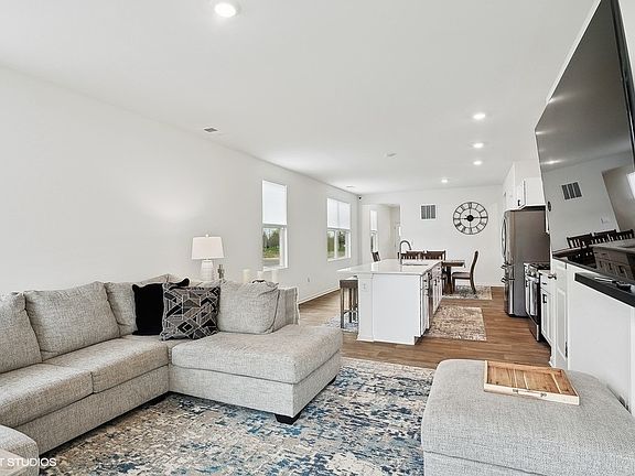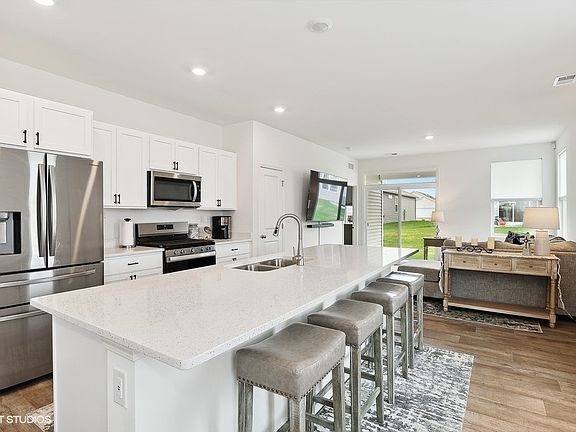 THE POOL IS OPEN! New aquatic center is ready for you to enjoy. Clubhouse to open soon. Better than brand new! This new construction home in a low maintenance community has had the finishing touches put on it by the current owners and is ready for you to move right in! Turn key finishes throughout, there's truly nothing you need to do before moving in. The corner lot brings all of the light into this open concept home. The beautiful kitchen features quartz countertops and designer cabinets as well as a breakfast bar for additional seating. There are two spacious bedrooms along with a den that can be used as an office to work from home. The primary bedroom has a walk in closet as well as an en suite bathroom. All new appliances, including the washer, dryer and refrigerator, which were added after purchasing. The owners have installed an ADT security system as well as blinds, a garage door opener and cabinet hardware. HOA fee includes lawn care and snow removal to make this home maintenance free. Enjoy the summer on the covered porch off the living room or on the walking paths throughout Stonewater. Come see it today!