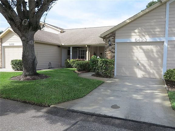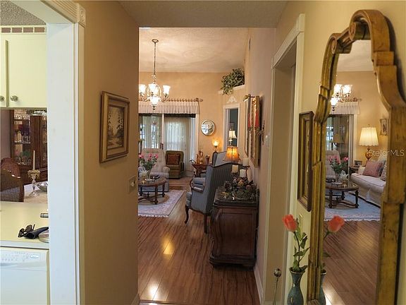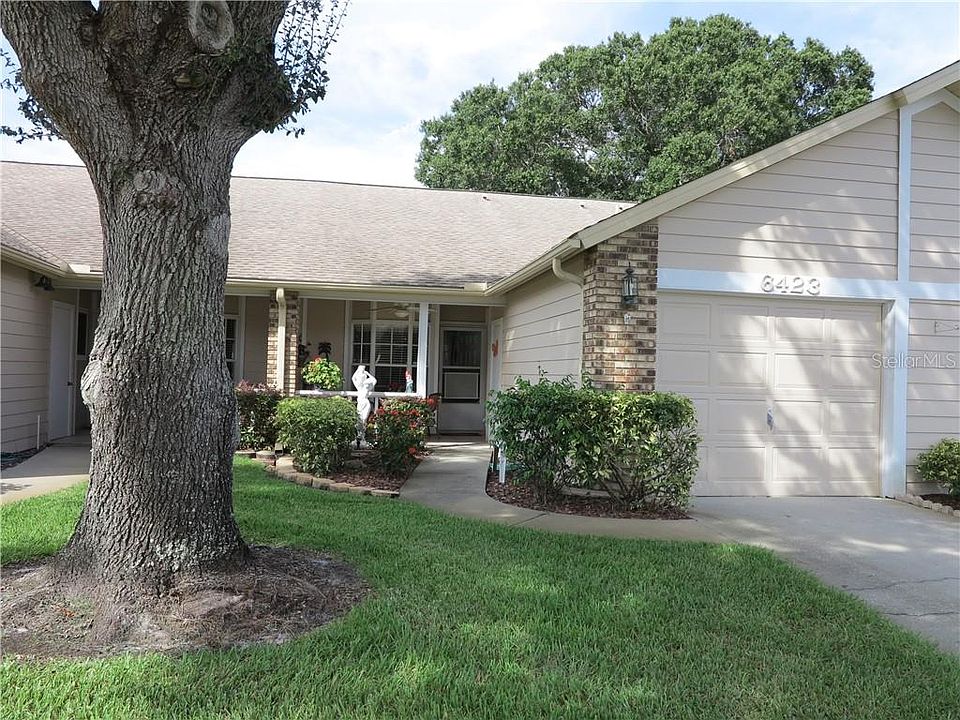 2 BEDROOM/2 FULL BATHROOMS, NO STAIRS. IN MOVE-IN CONDITION . Numerous upgrades include newer windows, laminate flooring in main living areas, newer appliances with new washer/dryer. , A/C only 3 years old, & all doors & frames have been replaced i.Beautiful tile flooring in entryway, kitchen, & baths. Upon entering, kitchen on left with solid surface range, tile back splash, generous cabinetry, breakfast bar, eating area, & serve through opening to dining area. Just beyond entryway is combination living room / dining room featuring skylight, vaulted ceiling, recessed lighting, . In rear of the home is Florida room, VENTED for central heat & air & is included in the sq. ft. of the home. You'll love the architectural detail including crown molding, plant shelves, & grill work framing the doors. Spacious carpeted master suite features bath with custom made mirror with gold framing from Germany, chandelier, walk-in shower, & vanity with make-up area. 2nd bedroom with laminate flooring great for office too. Guest bath offers enclosed tub for those relaxing soaks. Spacious seating area on front porch for neighborhood visitors. Flooring in single car garage is textured. Low monthly maintenance fee of $140 includes exterior maintenance, ROOF replacement approx. every 8-10 yrs., exterior painting, grounds maintenance, pool, & trash. No dogs, 1 inside cat/2 birds allowed. Must own 3 yrs. before leasing. THE HIDDEN GEM OF NEW PORT RICHEY.