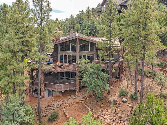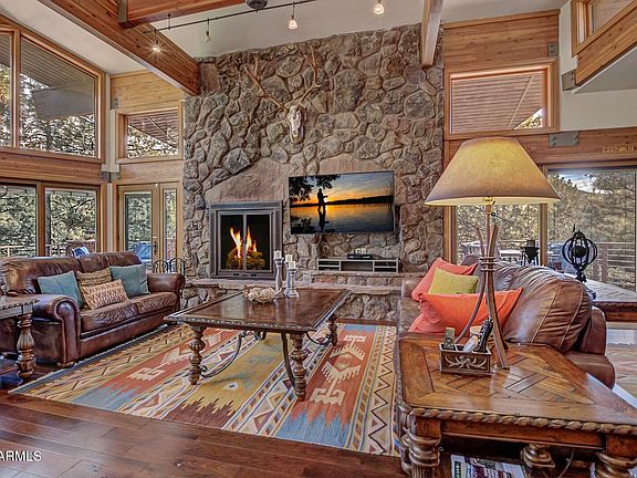 Incredible property! 2 lots, Exclusive location in the Pines. Remarkable blend of quiet beauty and meticulous attention to detail. 0.74A borders Tonto National Forest. Breathtaking views of the Mogollon Rim. The gourmet kitchen is a chef's dream, showcasing Brazilian marble countertops, hickory flooring and cabinetry and upgraded stainless steel appliances. Beautiful native stone fireplace--2--they add warmth and charm throughout the areas. The main level boasts a luxurious owner's retreat with an ensuite bath, complete with heated floors, a jetted tub and a custom closet for comfort ad convenience. The lower level invites you into a cozy family room with a fireplace, an office area, a library/storage space and a guest bedroom with a private bath. Entertaining is a breeze with a b bar area that includes a full-size wine refrigerator. Outdoor living is enhanced by covered, maintenance-free decks on both levels, perfect for relaxation and entertaining, along with a soothing outdoor spa for unwinding. Additional features include a durable metal roof, a spacious 2-car garage, a workshop and attic storage for added convenience. This exceptional home is a true retreat, offering luxury and tranquility in an unbeatable location--don't miss your chance to make it yours!