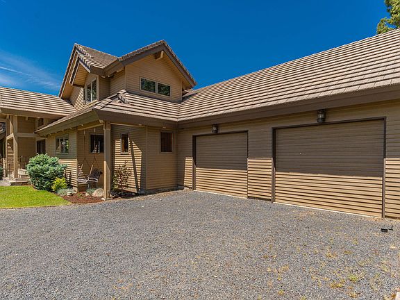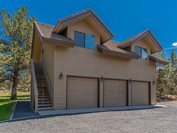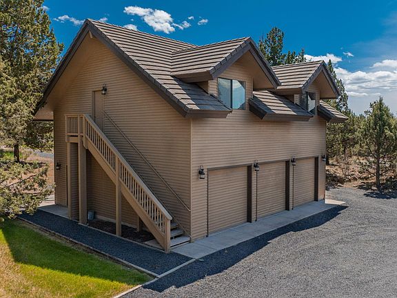 Escape to tranquility in this lodge-style home with vaulted cedar ceilings and a wall of view windows offering a 180-degree panorama of mountains. Step onto the immense deck or relax in the adjoining dining room with built-ins and a wet bar. Perfect for entertaining, with a bonus room for media or office space. The kitchen features a butcher block island, under-counter lighting, and all appliances. The main floor boasts a generous primary ensuite with upgrades like a double vanity, heated tile floor, tile shower, and soaking tub. Upstairs are two bedrooms and a second full bath. Outside, enjoy your swim spa on the deck, an oversized two-car garage with workbench, and a huge three-bay shop with workshop. Plenty of parking on the circular driveway and RV parking available. The 5-acre lot, with a generous lawn area, offers peaceful privacy in a quiet neighborhood very close to Bend.