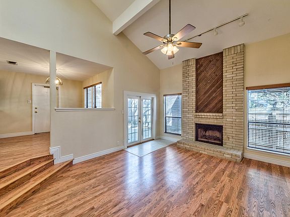 White brick fireplaceLarge oak treesNewer faucetsBosch dishwasherNew lighting fixturesCeiling fansDining area
