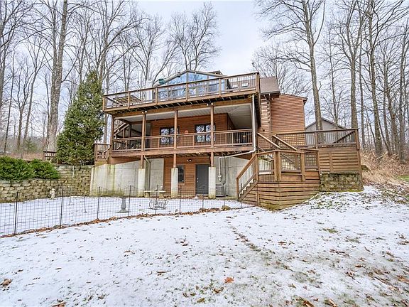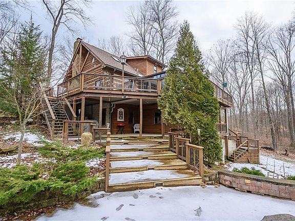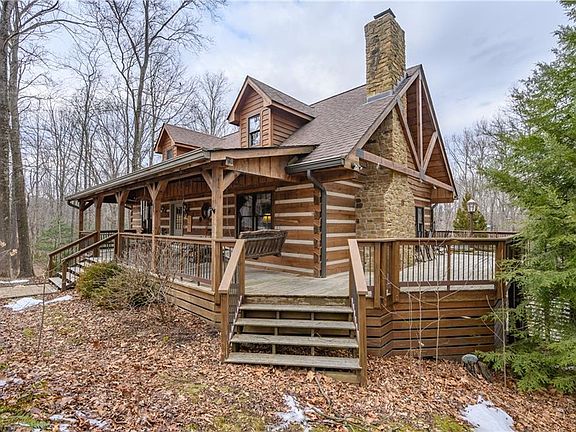 Beautiful log home on 7 wooded acs on dead end county road near "Whippoorwill Woods" - (858 ac nature preserve managed by The Nature Conservancy). Kitchen has granite counter-tops, 2 ovens, a wine-cooler & walk-in pantry. A BR & full BA on each level. Cuddle up to a warm fire from the wood-burning stone fireplace or jump into the hot tub on a chilly night. Enjoy breathtaking views from the spacious solarium. Take in the colorful fall foliage off one of the many decks or by the outside fire pit. Abundant wildlife viewing opportunities. 2-C det. garage w/workshop and tons of storage. Recent improvements include whole home generator, 2 a/c units & furnaces. Potential tourist rental subject to zoning approval. Fiber optic internet service.